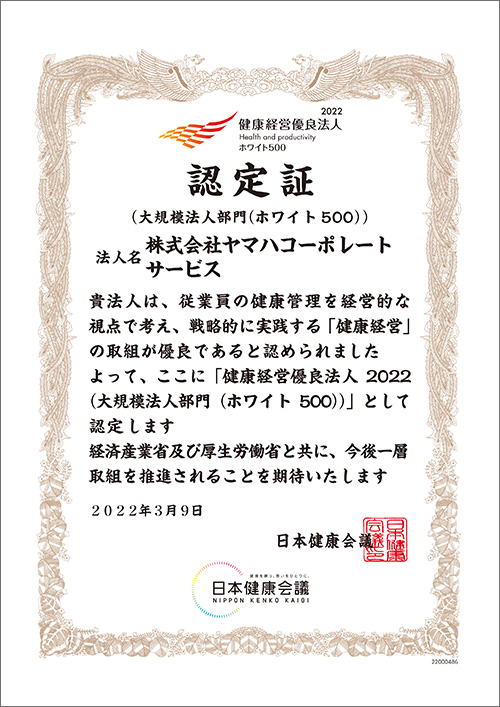 株式会社ヤマハコーポレートサービスは、経済産業省・日本健康会議が主催する「健康経営優良法人認定制度」の大規模法人部門において、特に優良な健康経営を実践している企業として認定を受けました。当社としては、5年連続の認定となります。