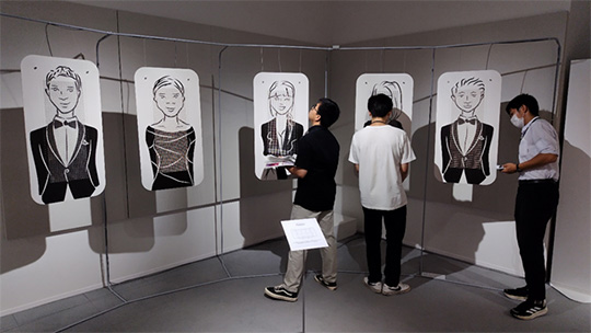 紙で出来た平面スピーカーFlatone™(フラットーン)に興味津々の3名(イノベーションロード見学)