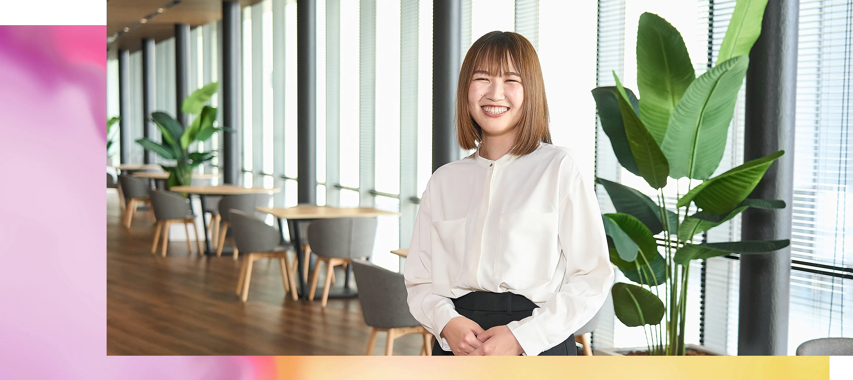 入社前は、事務職というのは淡々と業務を進めていくもの、というイメージを持っていましたが、企画に自分の意見を反映できる場面も多く、いい意味でギャップを感じています。自分の考えを取り入れながらより良い研修をつくっていけることに、楽しさややりがいを感じています。